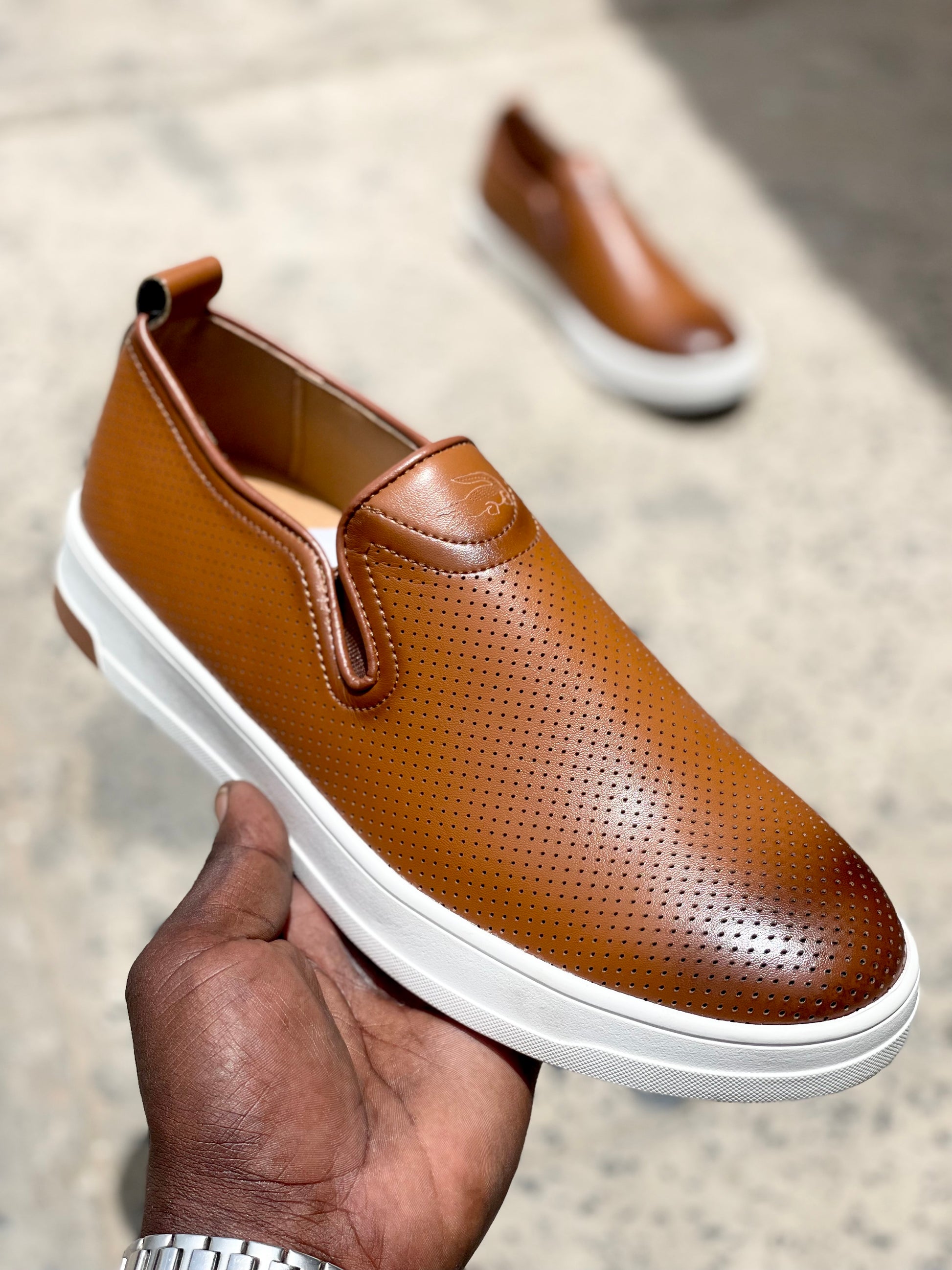 Chaussure slip-on élégante pour homme, confectionnée en cuir synthétique lisse de couleur marron caramel. Son design moderne est rehaussé de micro-perforations sur l’ensemble de l’empeigne, offrant une touche de style tout en favorisant la respirabilité. Le col est légèrement rembourré pour plus de confort, avec un empiècement élastique latéral qui facilite le chaussage. La semelle extérieure blanche en caoutchouc épais assure une bonne adhérence et un contraste visuel saisissant. Idéale pour un look décontracté chic au quotidien.