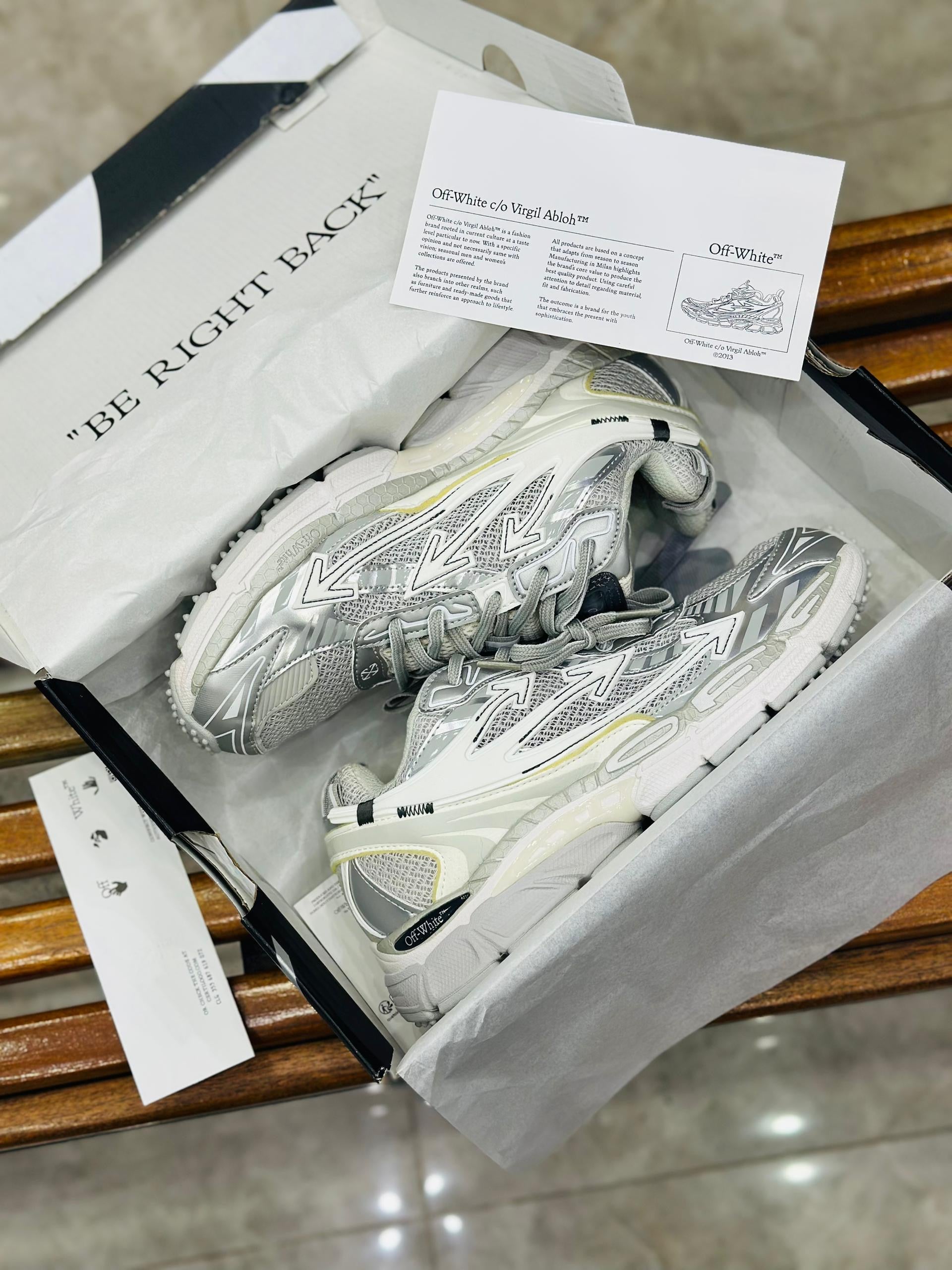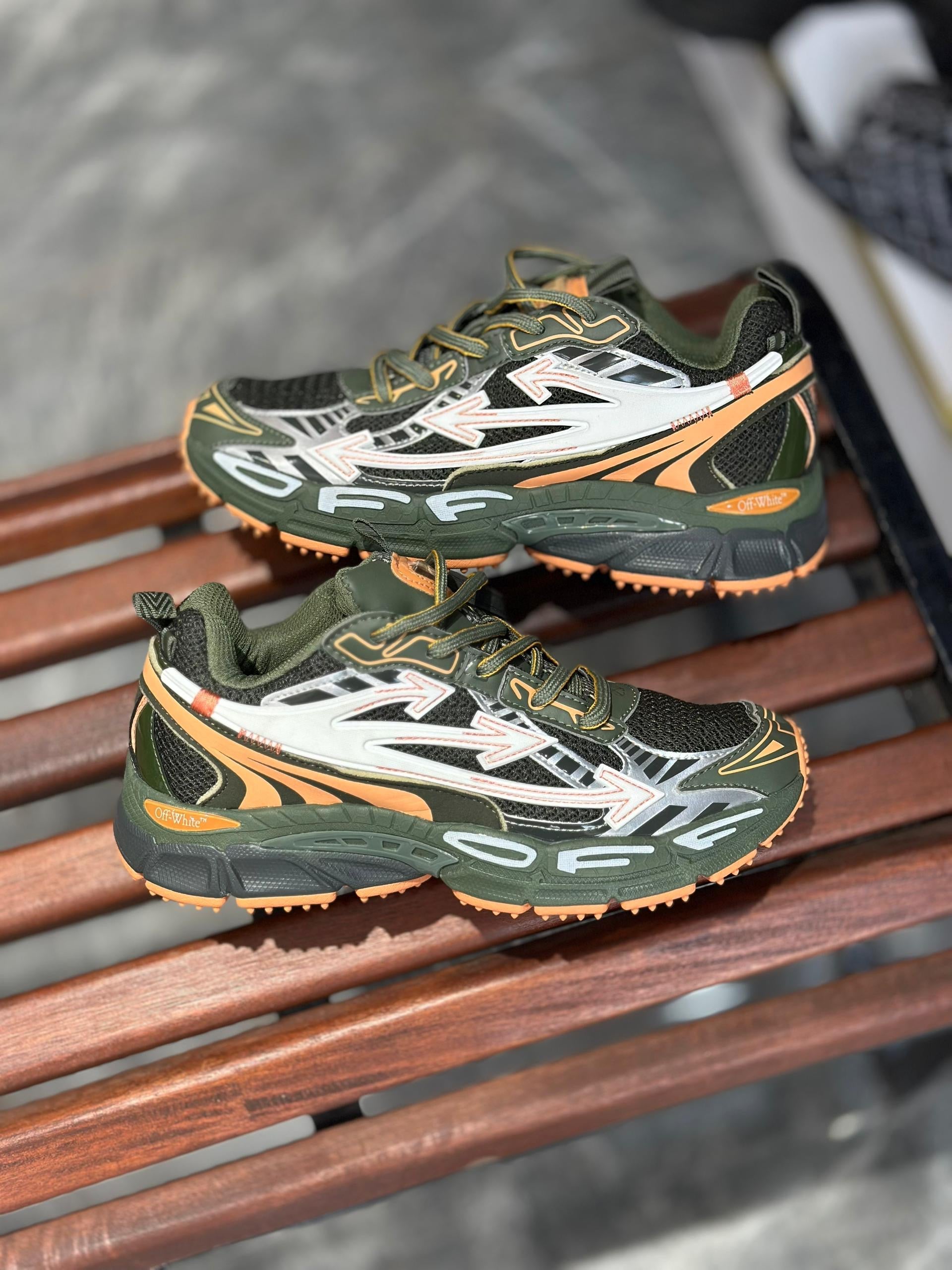 Ces baskets Off-White affichent un style sportif et audacieux, mêlant performance et esthétique streetwear haut de gamme. Elles présentent une base en mesh respirant noir et vert foncé, renforcée par des empiècements synthétiques pour plus de robustesse. Les côtés sont ornés de flèches Off-White signature en blanc et rose saumon, apportant une touche graphique et reconnaissable.