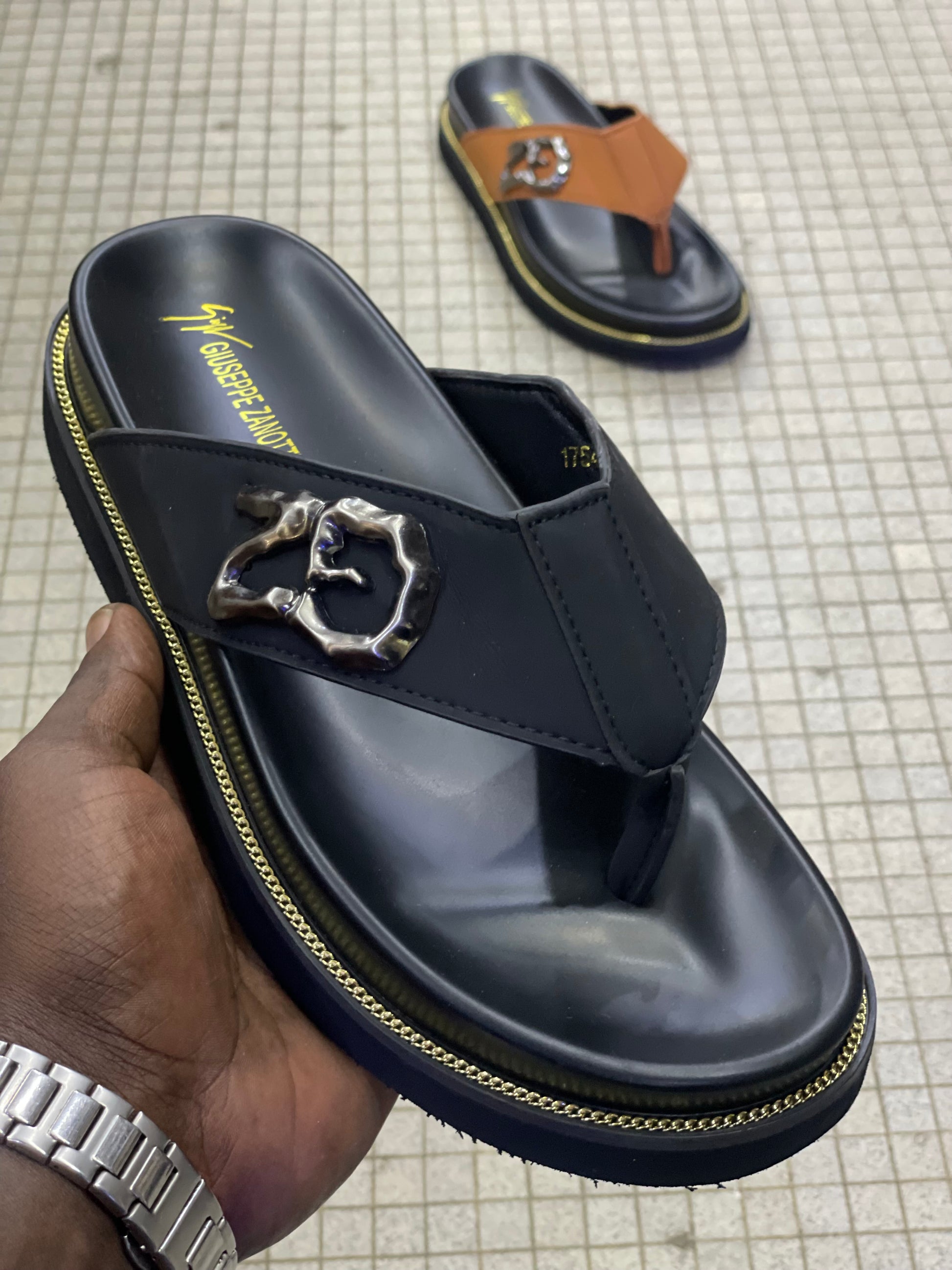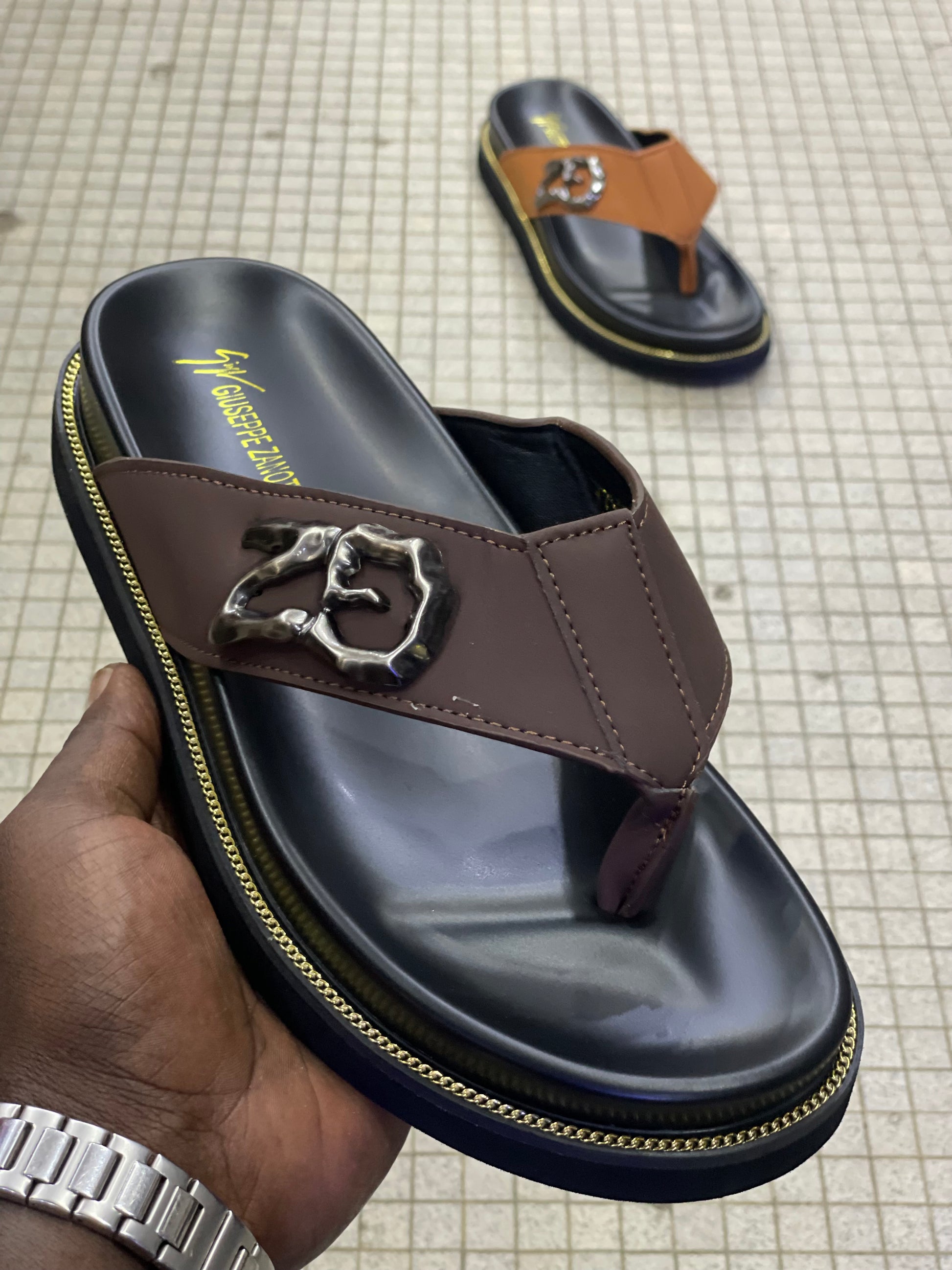La bride en cuir épais, ornée du logo métallique signature façon “20”, apporte un look distinctif et raffiné. La semelle intérieure est rembourrée pour un confort optimal, et la forme tong assure une bonne tenue du pied, même lors d’une longue marche.