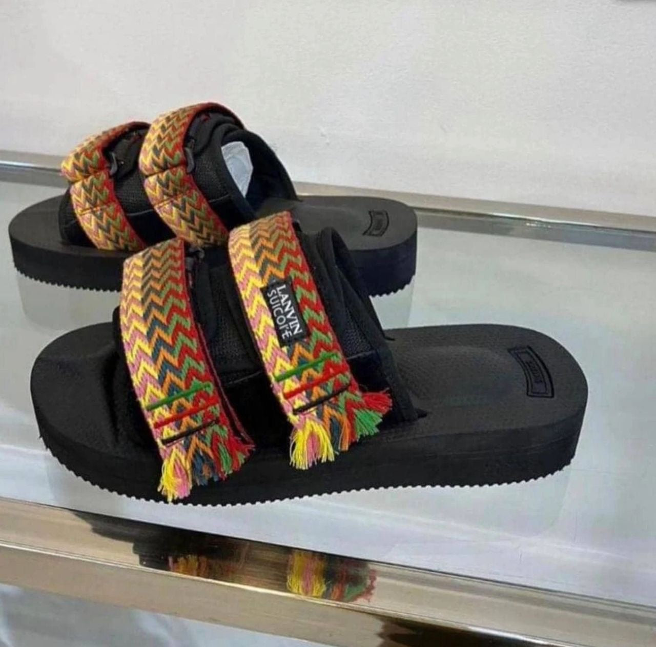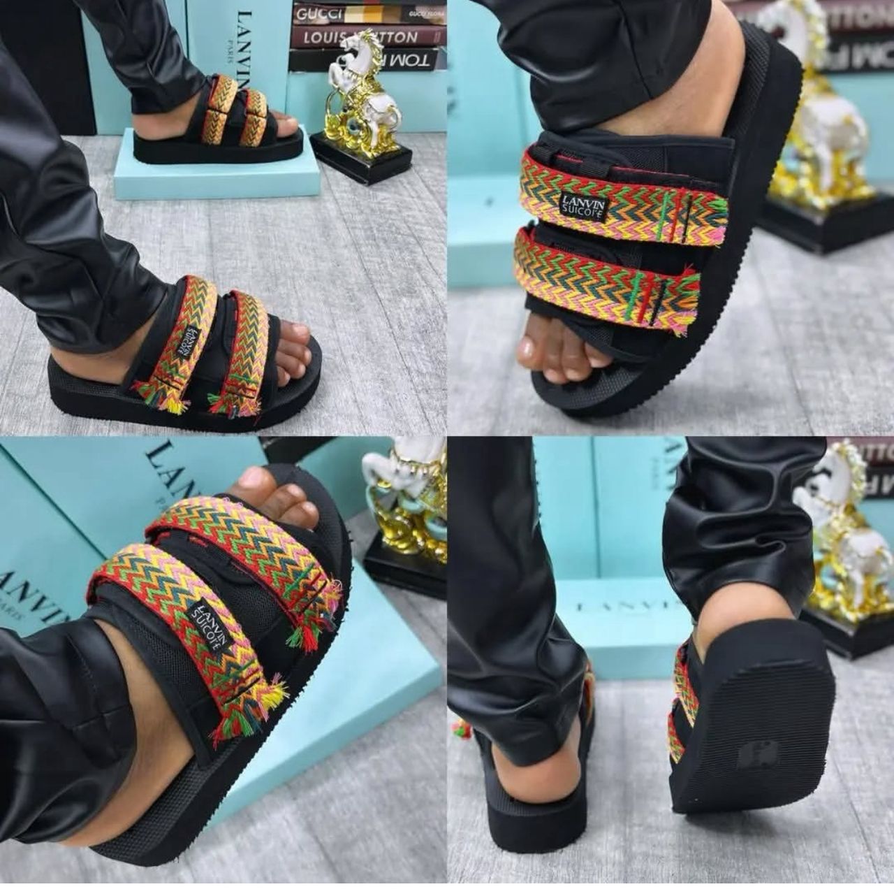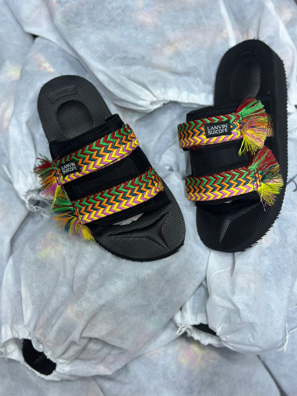 Sur l’une des brides, on peut lire l’étiquette “LANVIN SUECOMMA BONNIE”, indiquant une collaboration ou un modèle de créateur. L’aspect général est à la fois ethnique, urbain et tendance, parfait pour un look décontracté ou stylé en été.